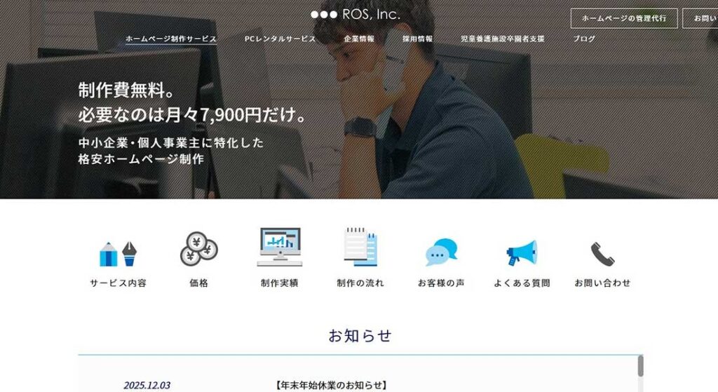 ROS株式会社は、初期制作費無料・月額7,900円からの定額制でホームページを提供する、中小企業・個人事業主向けの格安ホームページ制作会社です。