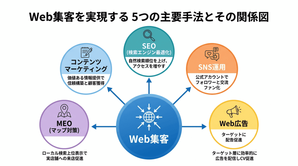 まとめ:5つの方法はそれぞれ単独でも効果がありますが、組み合わせることで相乗効果が生まれます。まずは自社の業種・予算・ターゲットに合った施策から始めましょう。