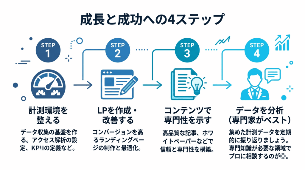 ただし、データの分析や具体的な改善施策は専門知識が必要な領域でもあります。「数字を見ても何を改善すればいいかわからない」という場合は、web集客の専門家に相談するのも有効な選択肢です。特に、計測環境の構築やCVタグの設定などの技術的な部分は、プロに任せることで確実に成果につなげることができます。