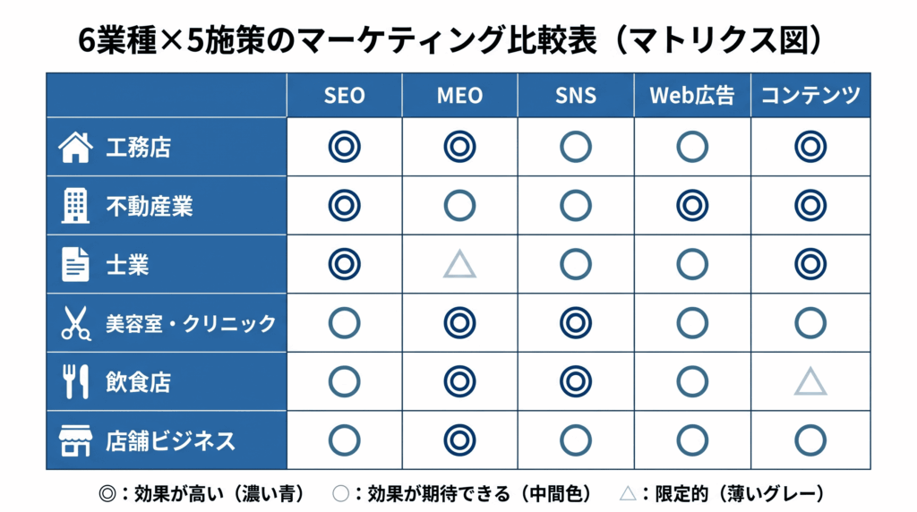 上記以外の店舗ビジネス(整体院、エステ、学習塾など)でも、基本的な考え方は共通です。まずはMEOとローカルSEOで地域の検索を押さえ、その上でリピーター施策(LINE・メルマガ)やイベント集客を組み合わせましょう。
