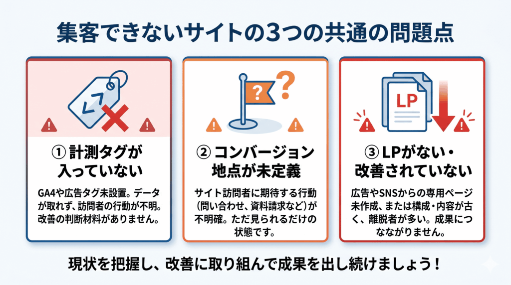私たちは日々多くの企業サイトを分析していますが、「ホームページから集客できていない」というサイトには、共通する3つの問題があります。